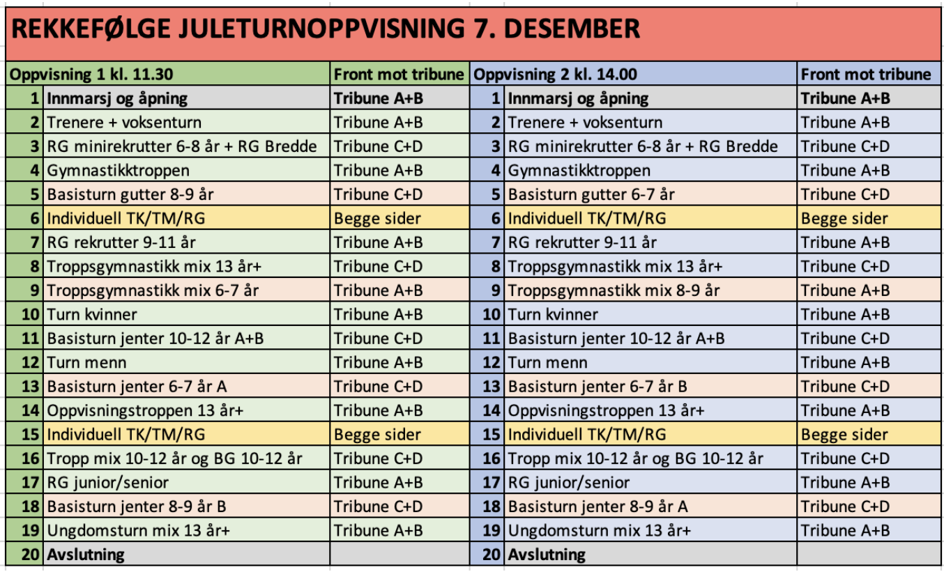 Oppmøte denne dagen er også i garderobene (samme garderobe som generalprøven). Her vil trenerne møte gymnastene til gitt tidspunkt ovenfor. Fint om dere ikke møter opp tidligere enn oppsatt tid.