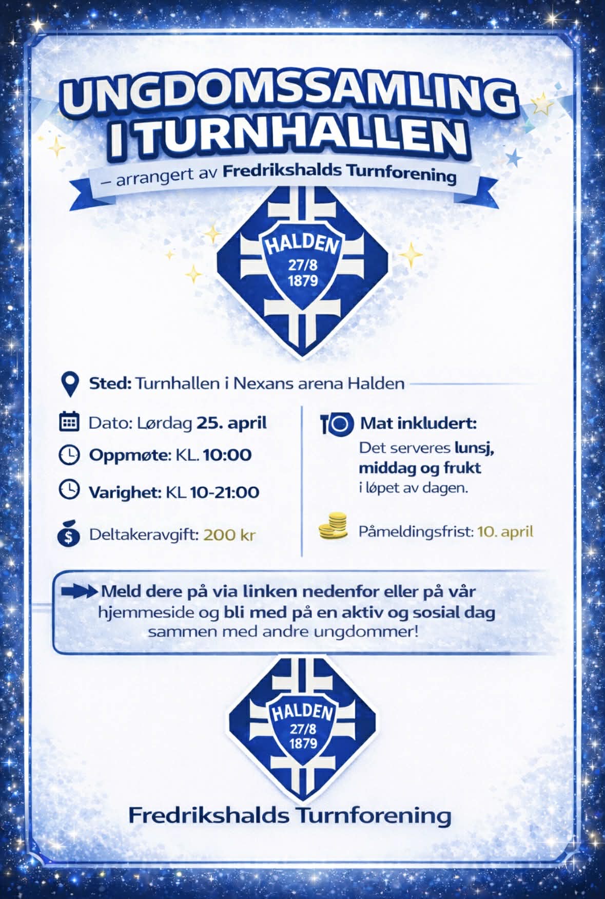 mars 16, 2026 Ungdomssamling 13-19 år! By Fredrikshalds turnforening · 1 minute read Vi inviterer til ungdomssamling i turnhallen for gutter og jenter født 2006-2012 lørdag 25.april! Vi håper DU blir med! Invitasjon finner du her! Påmelding finner du her! Del: facebook-f icon linkedin-in icon twitter icon pinterest-p icon envelope icon
